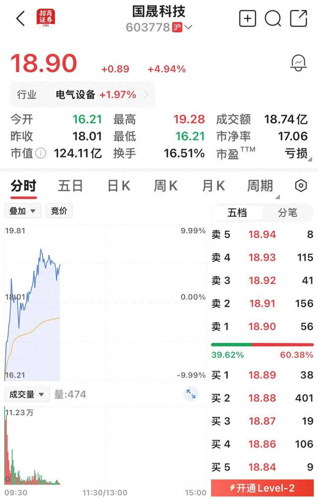 截至发稿时,国晟科技市值124.11亿元。